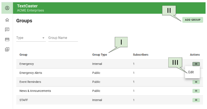 If your TextCaster system does not currently include Category Groups and you would like to add the feature, you will need to contact TextCaster Support at 833-399-8100 or “Support@textcaster.com”.
