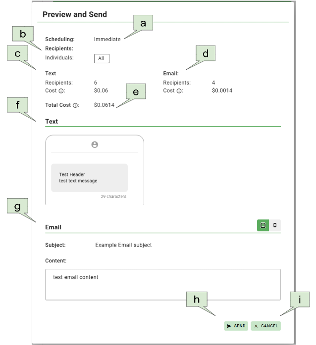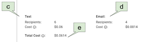 An estimate of the message fees for sending this message. If recipients are in more than one group listed, the message fees displayed will add the total. This is only an estimate; once deduplication occurs, you will only be charged for the actual number of unique recipients.
