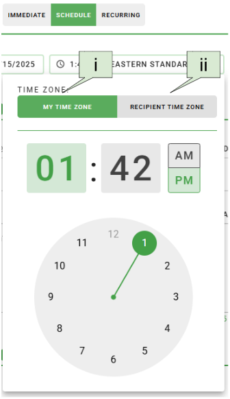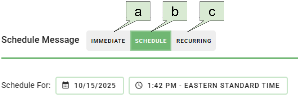 b. To schedule a message for later delivery, click on the “schedule” toggle. When scheduling a message, you have two options for setting time: